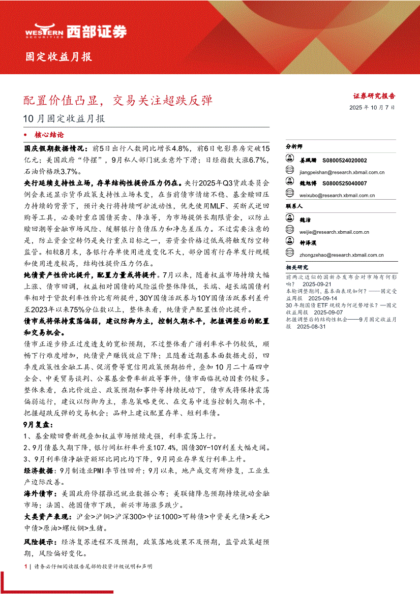 西部证券-10月固定收益月报:配置价值凸显,交易关注超跌反弹-251007