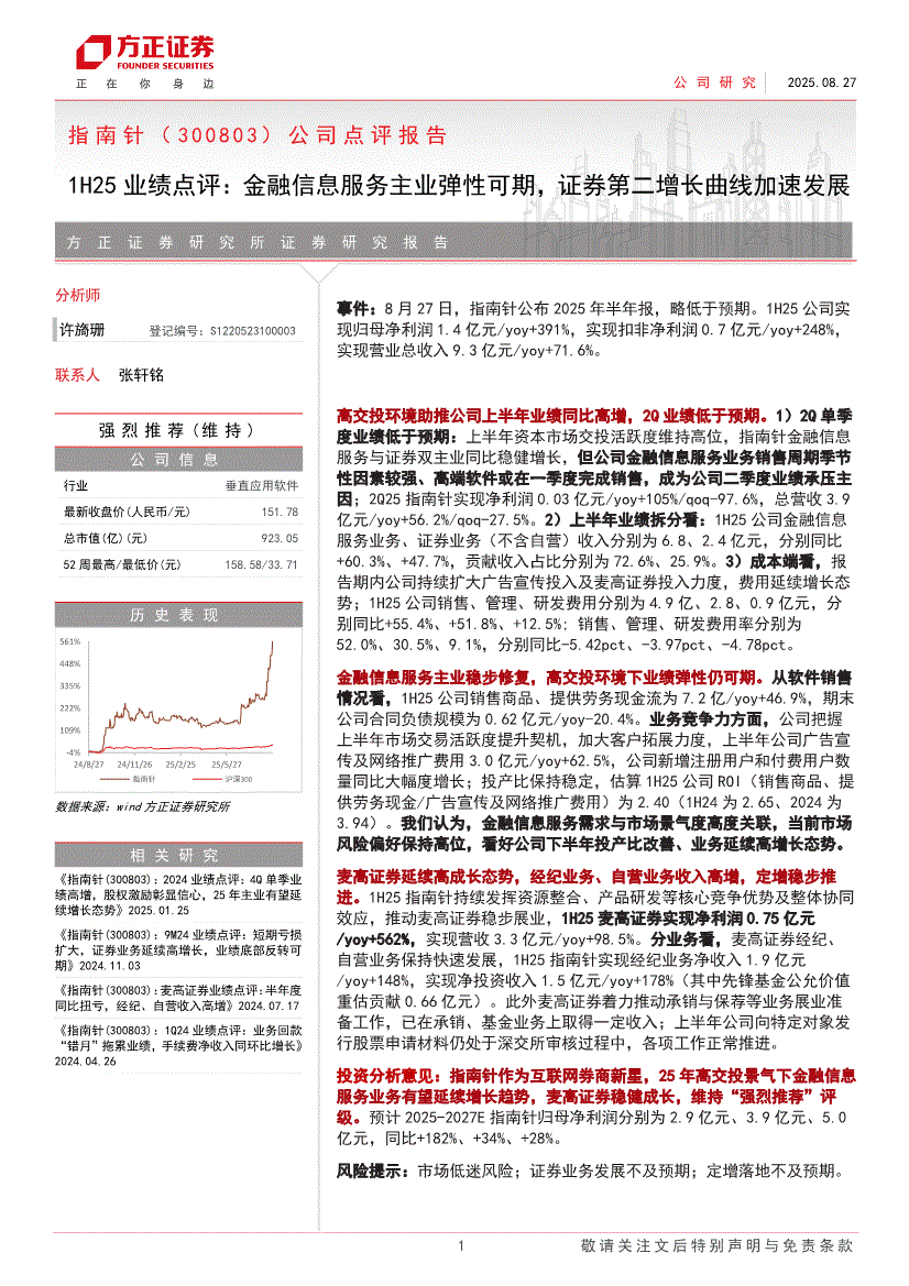 指南针:方正证券-指南针-300803-公司点评报告:1H25业绩点评,金融信息服务主业弹性可期,证券第二增长曲线加速发展-250827