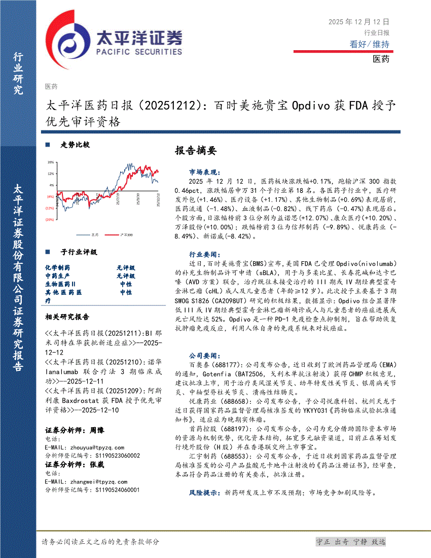 医药行业:太平洋证券-医药行业日报:百时美施贵宝Opdivo获FDA授予优先审评资格-251212