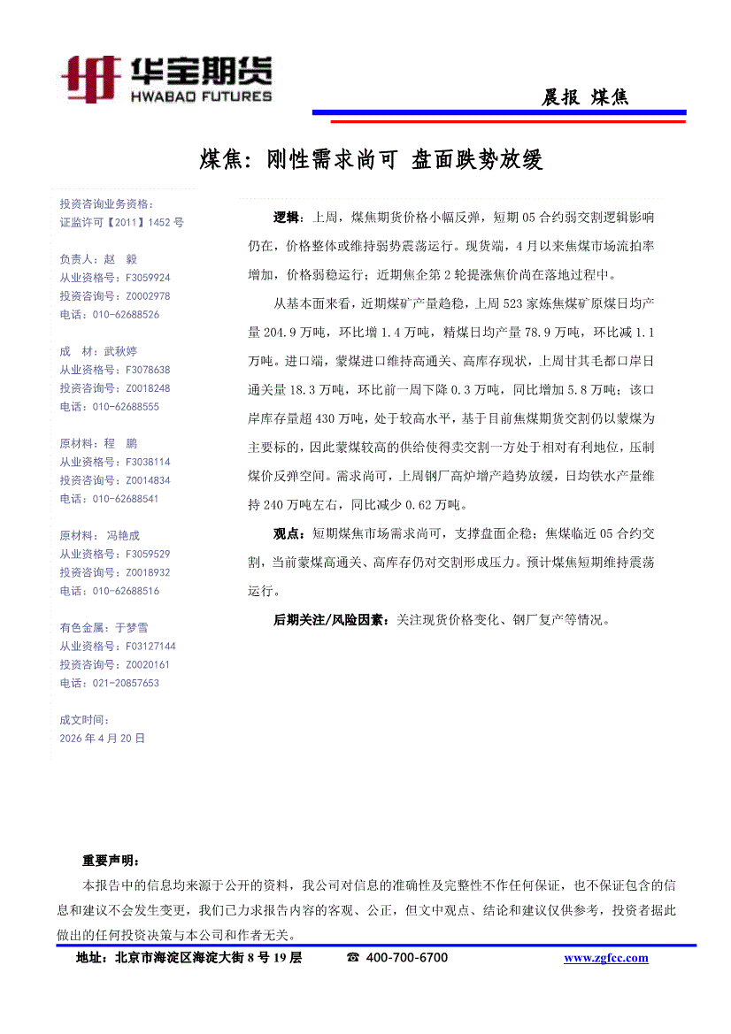 华宝期货-煤焦:刚性需求尚可,盘面跌势放缓-260420