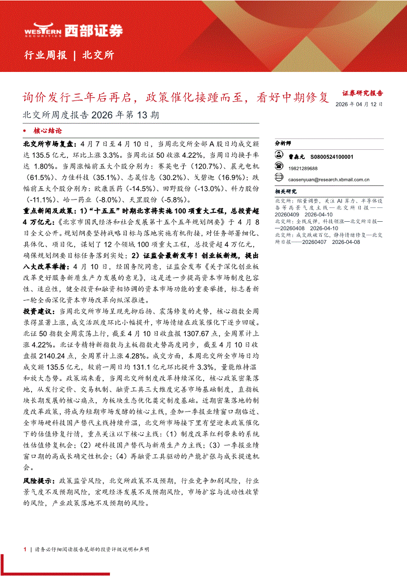 西部证券-北交所周度报告2026年第13期:询价发行三年后再启,政策催化接踵而至,看好中期修复-260412