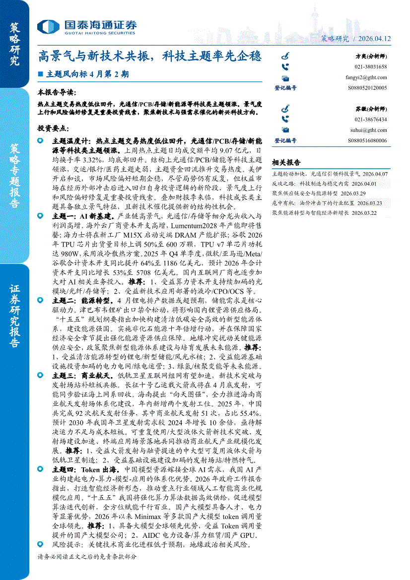 国泰海通证券-主题风向标4月第2期:高景气与新技术共振,科技主题率先企稳-260412