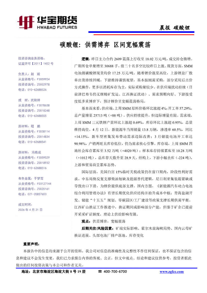 华宝期货-碳酸锂晨报:供需博弈,区间宽幅震荡-260421