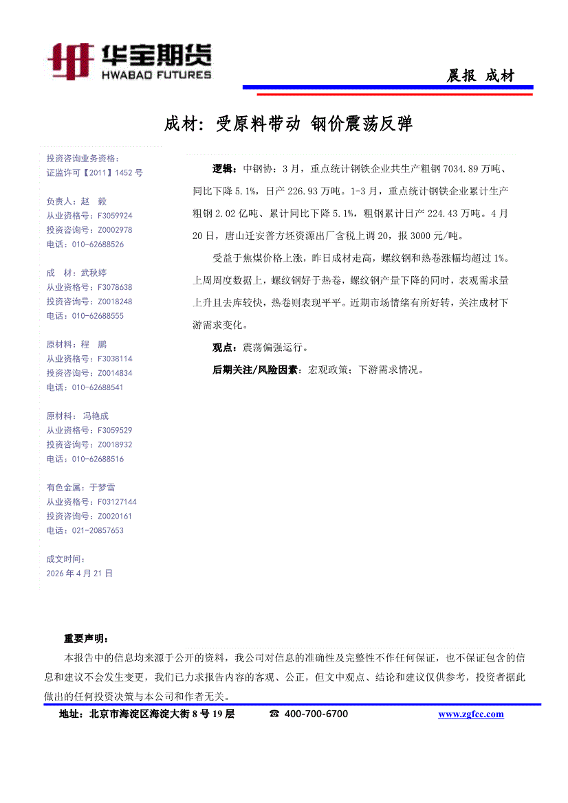 华宝期货-成材:受原料带动,钢价震荡反弹-260421