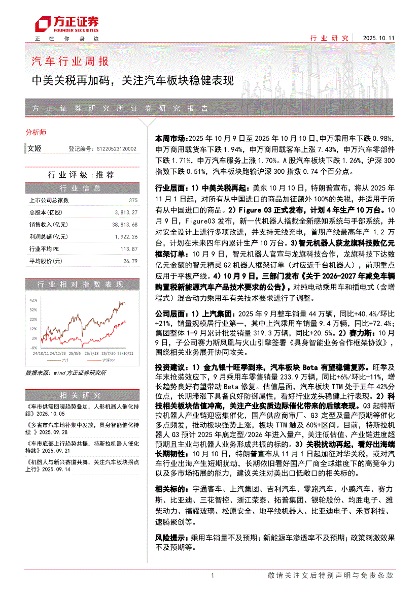 汽车行业:方正证券-汽车行业周报:中美关税再加码,关注汽车板块稳健表现-251011