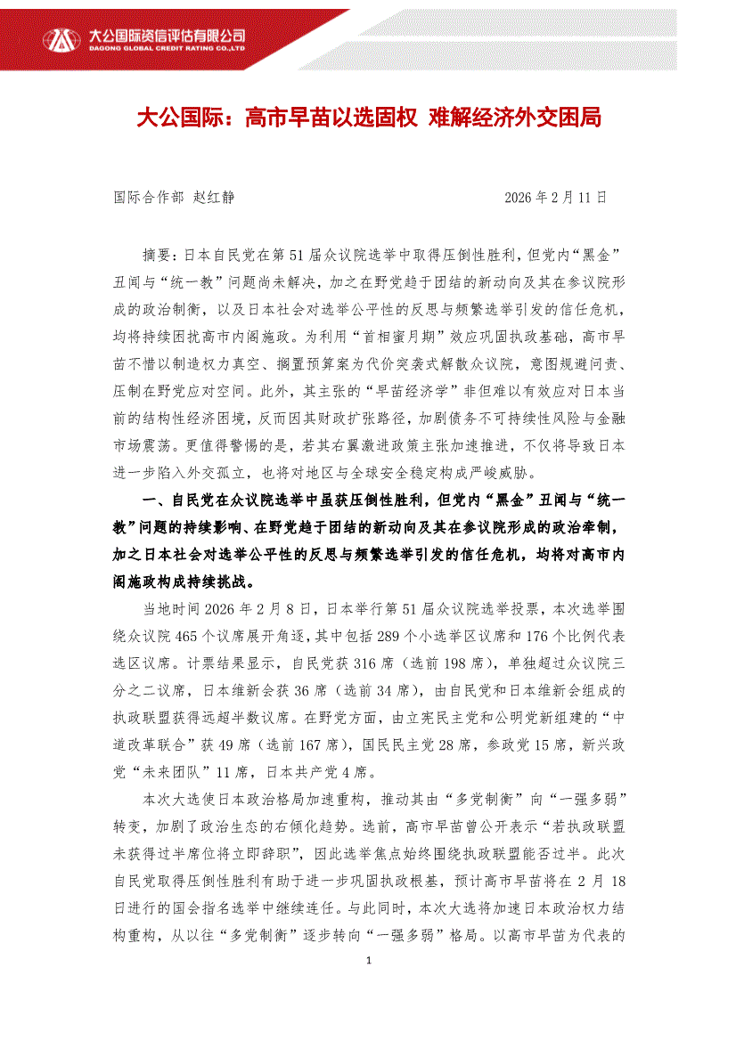 大公国际-高市早苗以选固权,难解经济外交困局-260211