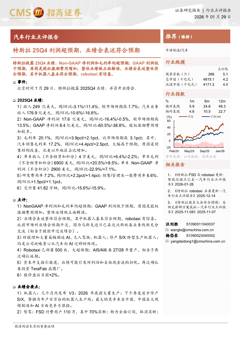 汽车行业:招商证券-汽车行业点评报告:特斯拉25Q4利润超预期,业绩会表述符合预期-260129