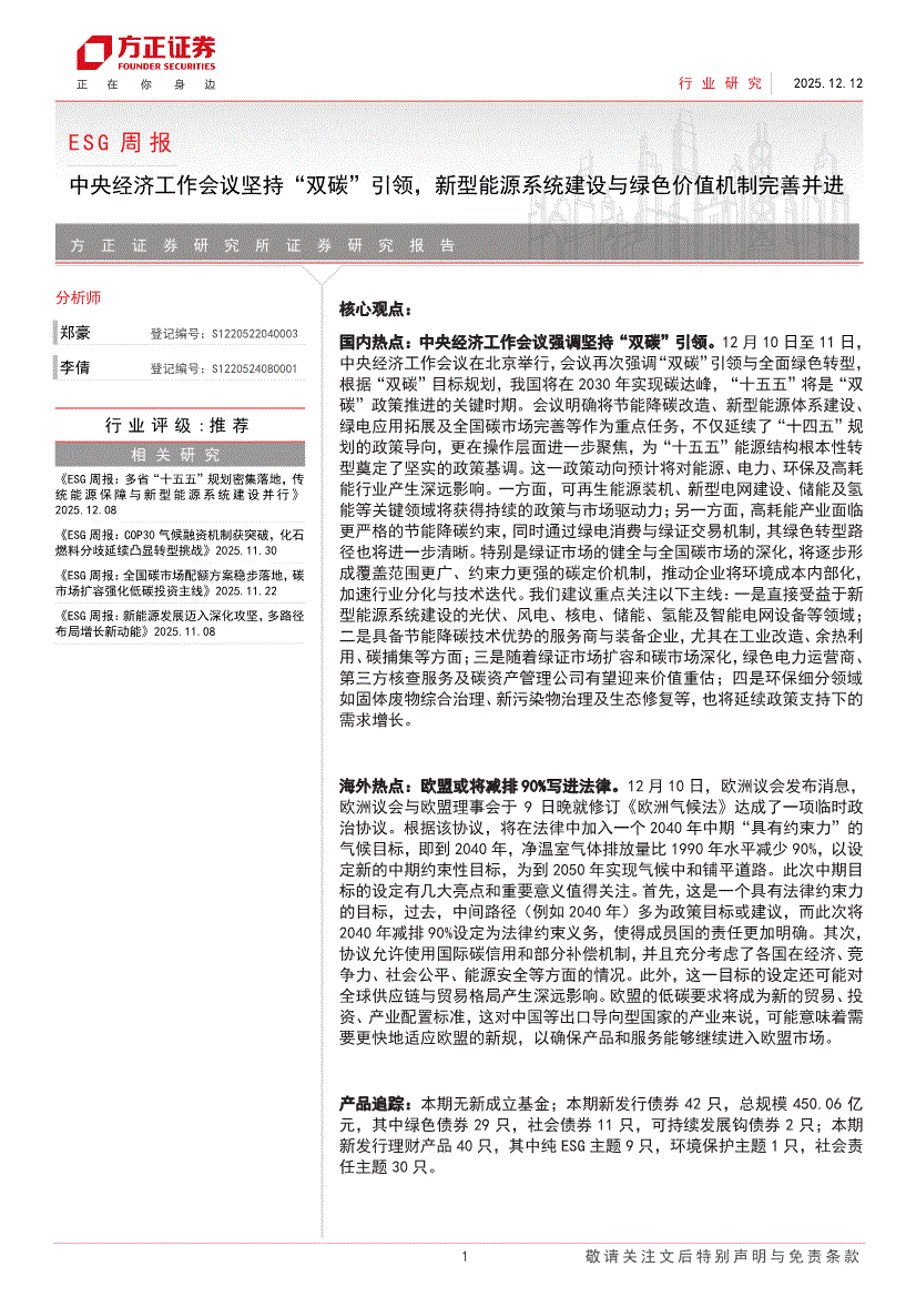 ESG行业:方正证券-ESG行业周报:中央经济工作会议坚持“双碳”引领,新型能源系统建设与绿色价值机制完善并进-251212