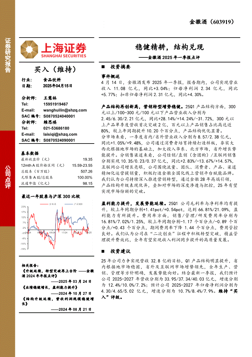 金徽酒:上海证券-金徽酒-603919-2025年一季报点评:稳健精耕,结构兑现-250415