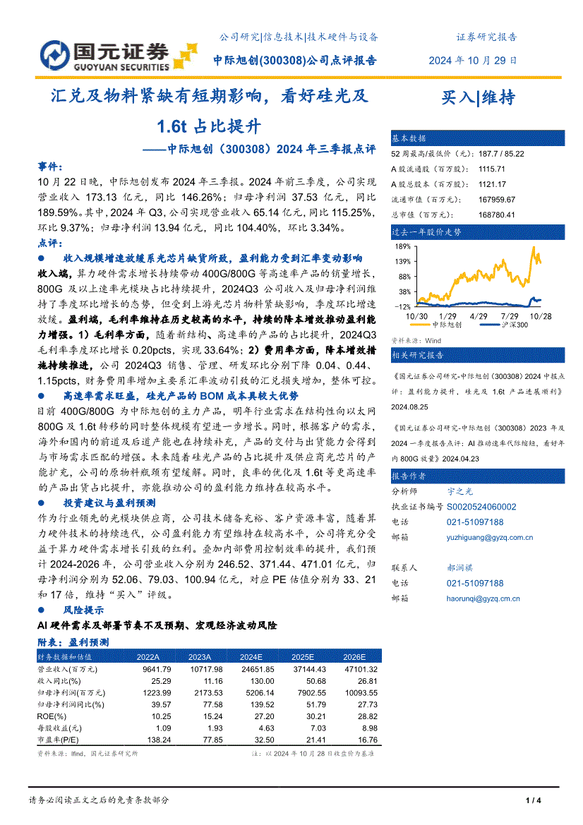 中际旭创:国元证券-中际旭创-300308-2024年三季报点评:汇兑及物料紧缺有短期影响,看好硅光及1.6t占比提升-241029