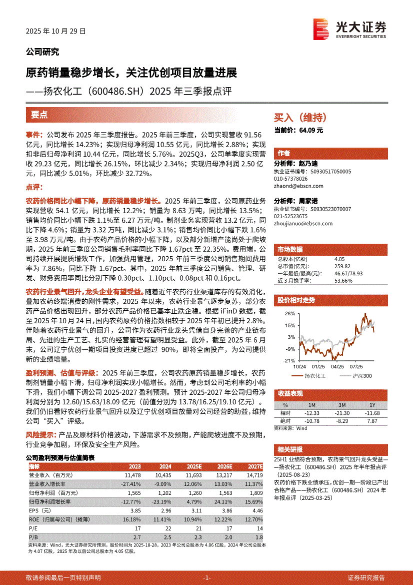 扬农化工:光大证券-扬农化工-600486-2025年三季报点评:原药销量稳步增长,关注优创项目放量进展-251029