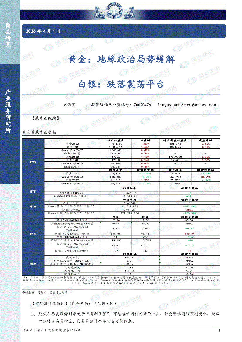 国泰君安期货-黄金:地缘政治局势缓解,白银,跌落震荡平台-260401