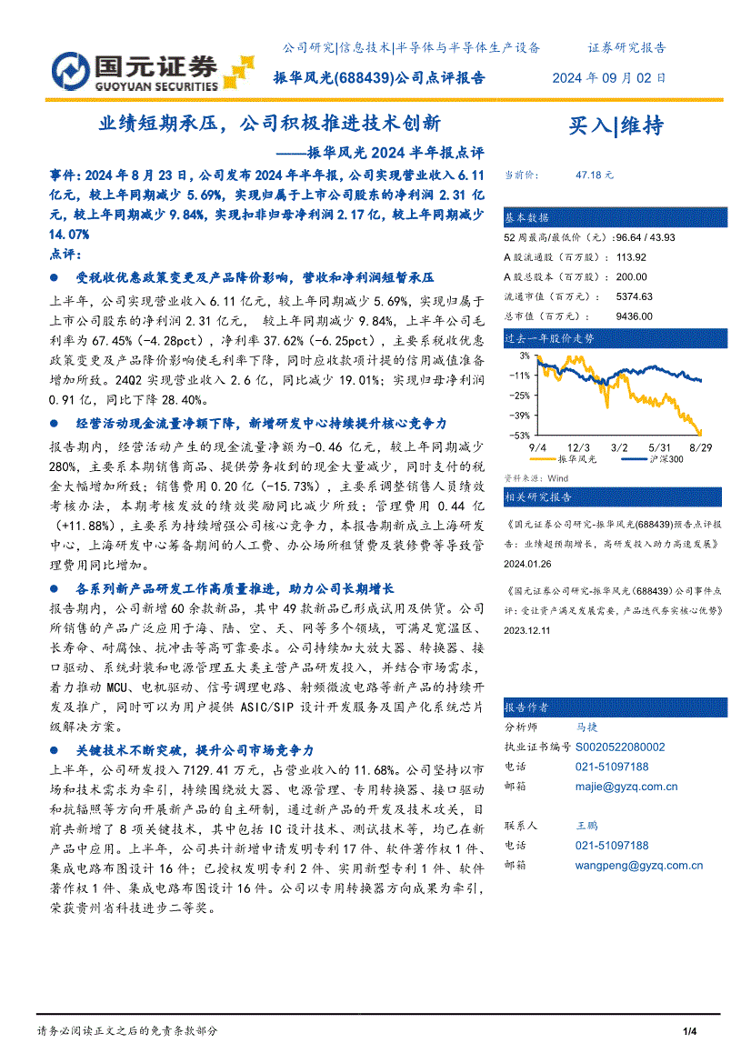 振华风光:国元证券-振华风光-688439-2024半年报点评:业绩短期承压,公司积极推进技术创新-240902