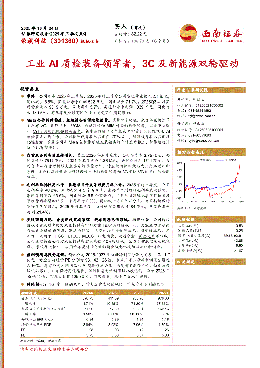 荣旗科技:西南证券-荣旗科技-301360-工业AI质检装备领军者,3C及新能源双轮驱动-251024