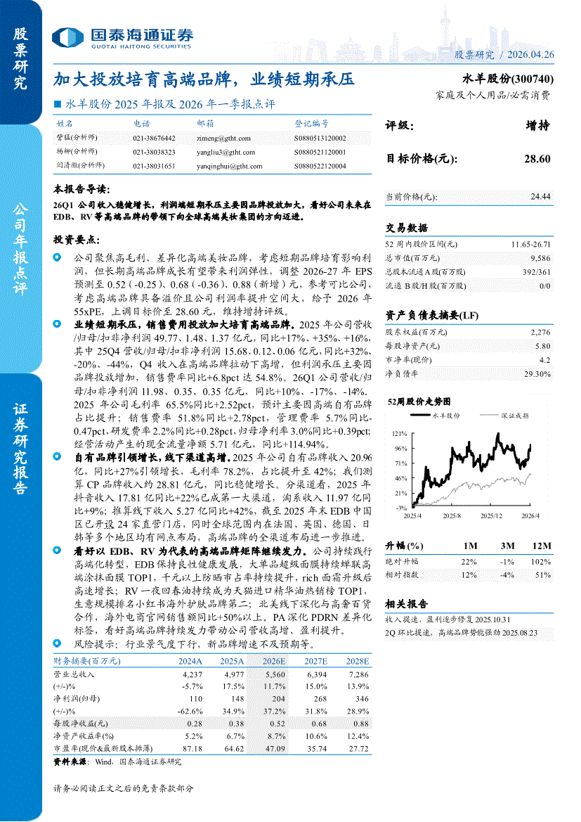 水羊股份:国泰海通证券-水羊股份-300740-2025年报及2026年一季报点评:加大投放培育高端品牌,业绩短期承压-260426