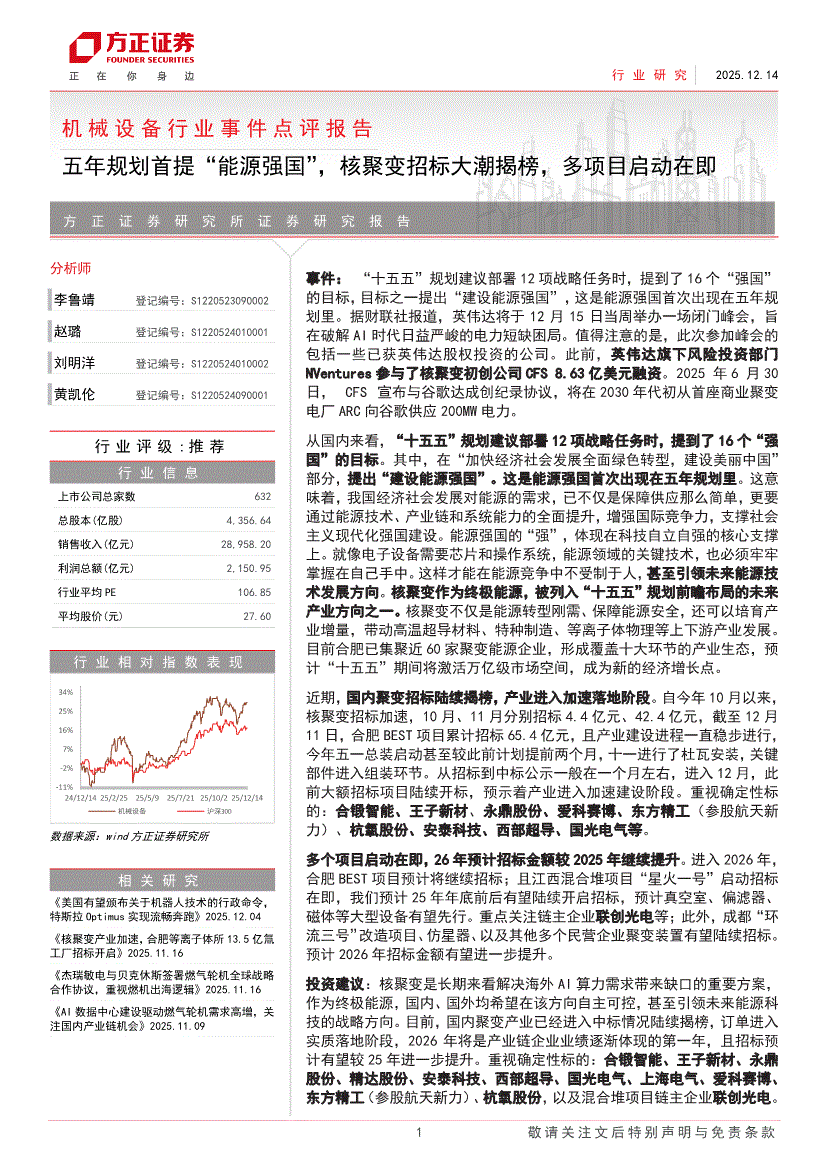 机械设备行业:方正证券-机械设备行业事件点评报告:五年规划首提“能源强国”,核聚变招标大潮揭榜,多项目启动在即-251214