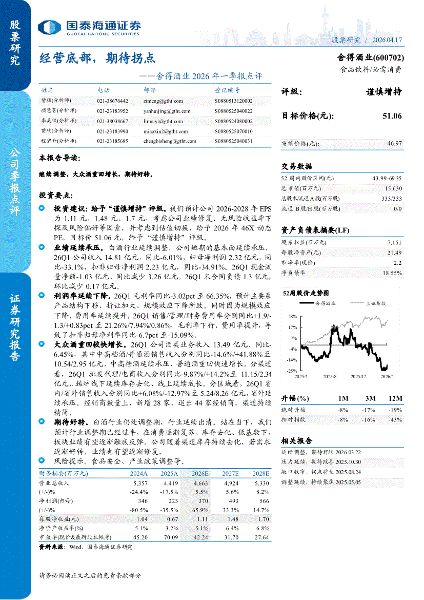 舍得酒业:国泰海通证券-舍得酒业-600702-2026年一季报点评:经营底部,期待拐点-260417