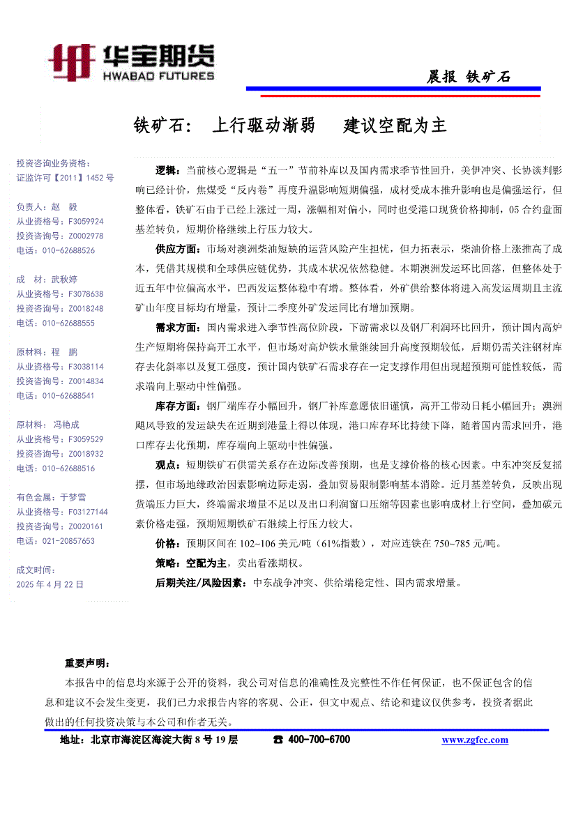 华宝期货-铁矿石晨报:上行驱动渐弱,建议空配为主-260422