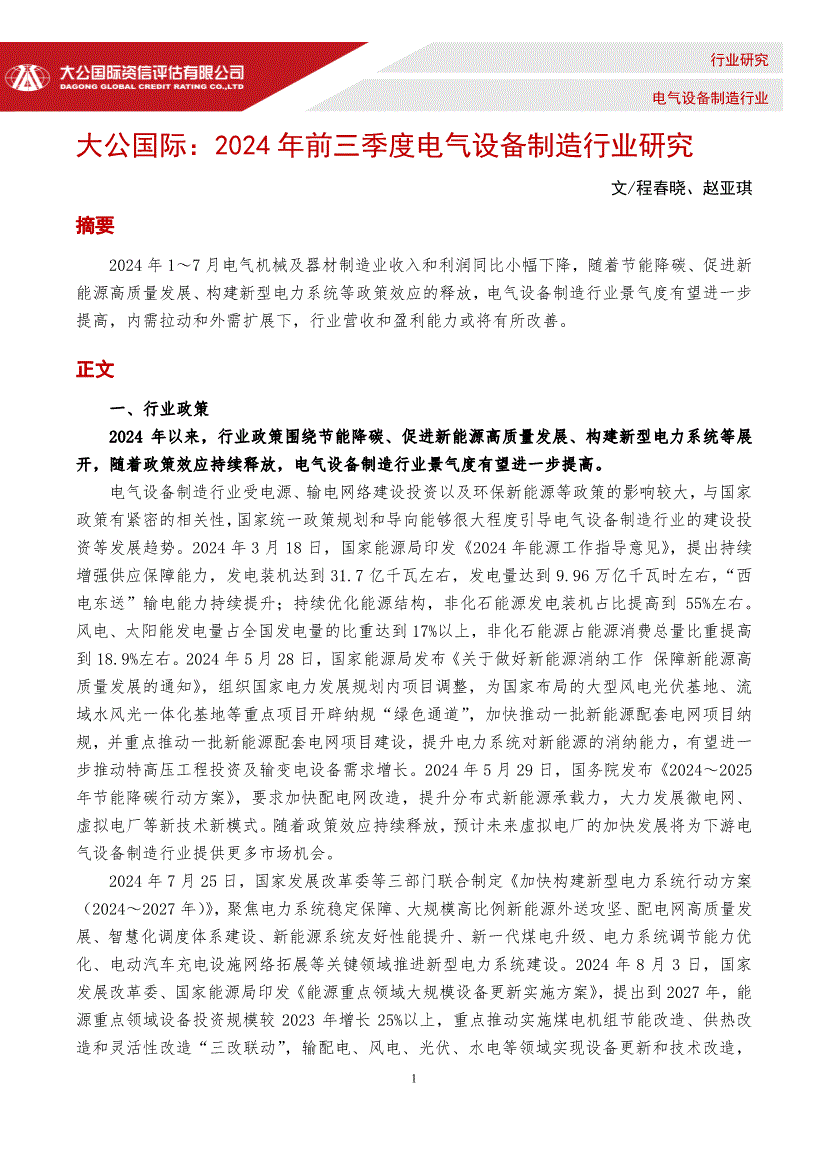 电气设备制造行业:大公国际-2024年前三季度电气设备制造行业研究-240924