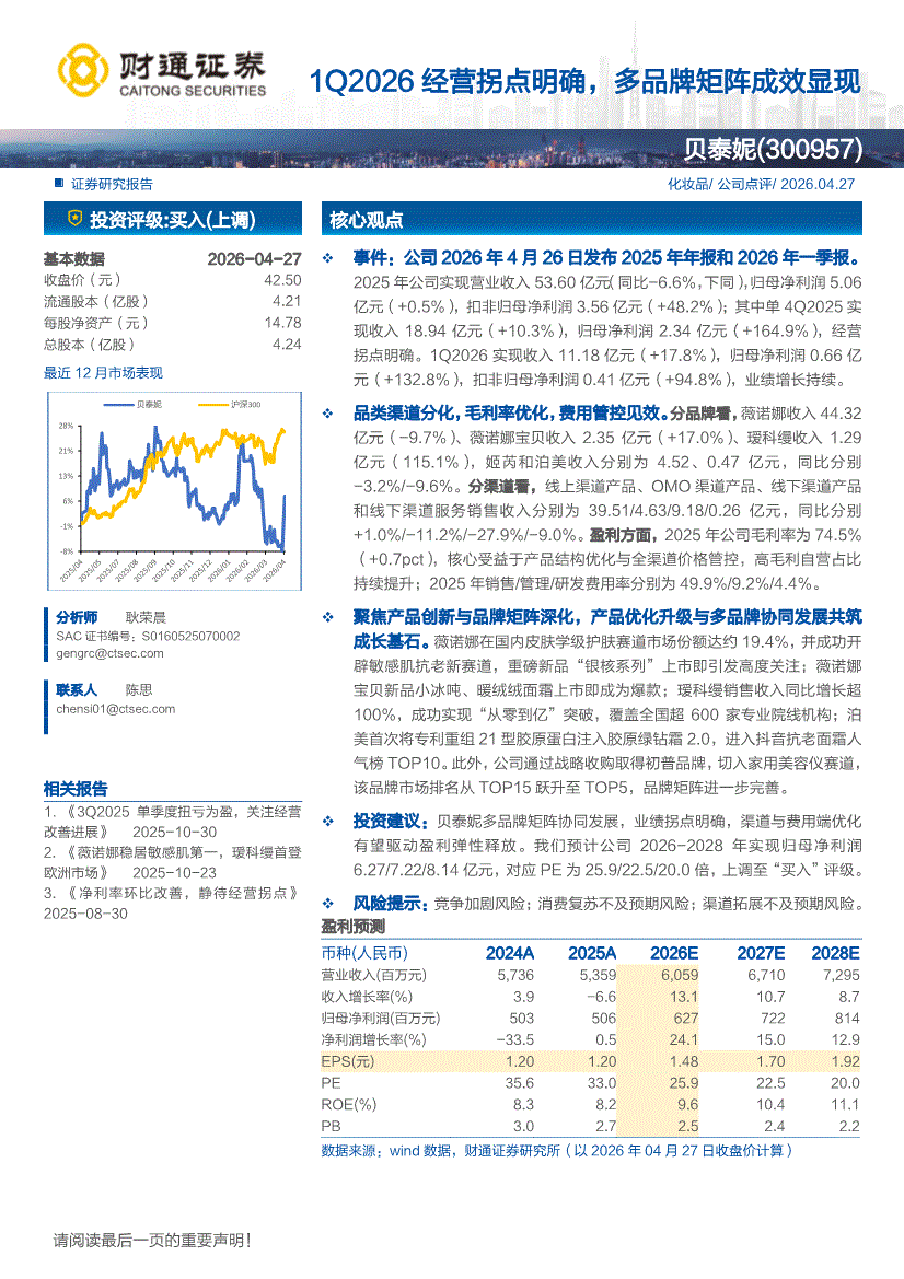 贝泰妮:财通证券-贝泰妮-300957-1Q2026经营拐点明确,多品牌矩阵成效显现-260427
