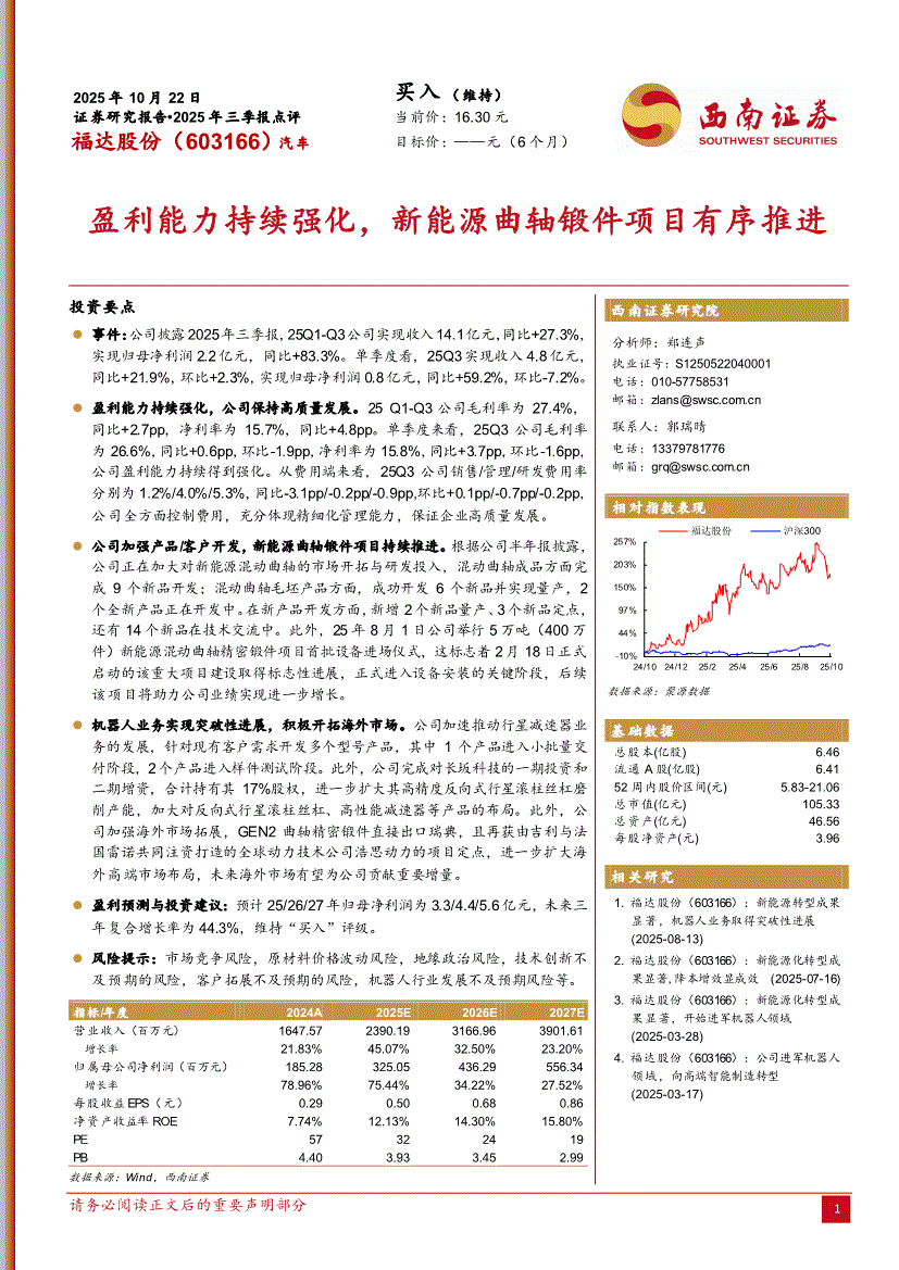 福达股份:西南证券-福达股份-603166-盈利能力持续强化,新能源曲轴锻件项目有序推进-251022