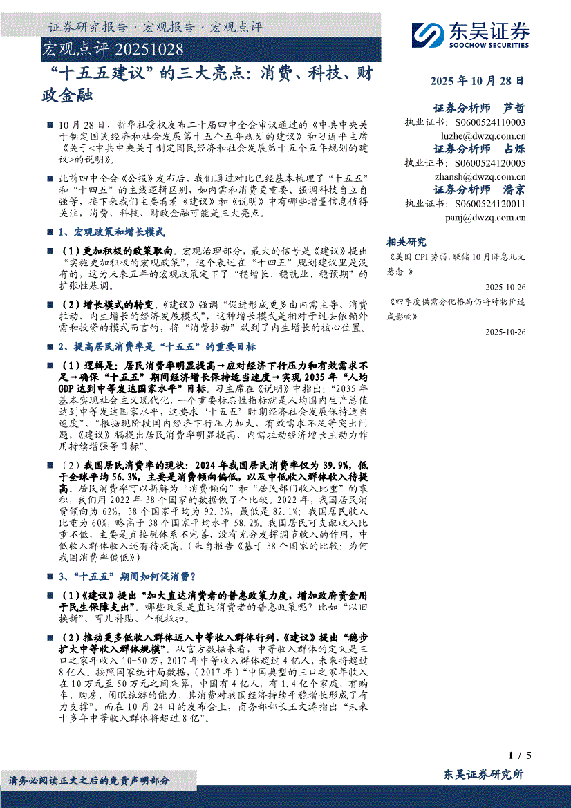 东吴证券-宏观点评:“十五五建议”的三大亮点,消费、科技、财政金融-251028