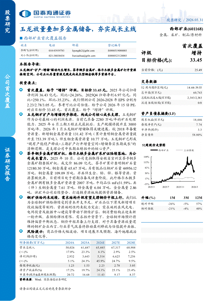 西部矿业:国泰海通证券-西部矿业-601168-首次覆盖报告:玉龙放量叠加多金属储备,夯实成长主线-260331