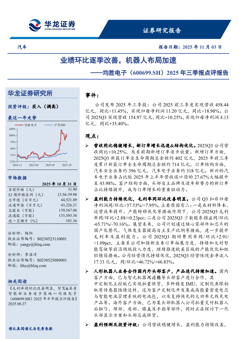 均胜电子:华龙证券-均胜电子-600699-2025年三季报点评报告:业绩环比逐季改善,机器人布局加速-251103