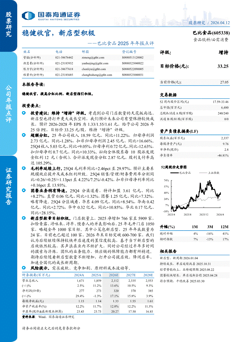 巴比食品:国泰海通证券-巴比食品-605338-2025年年报点评:稳健收官,新店型积极-260412