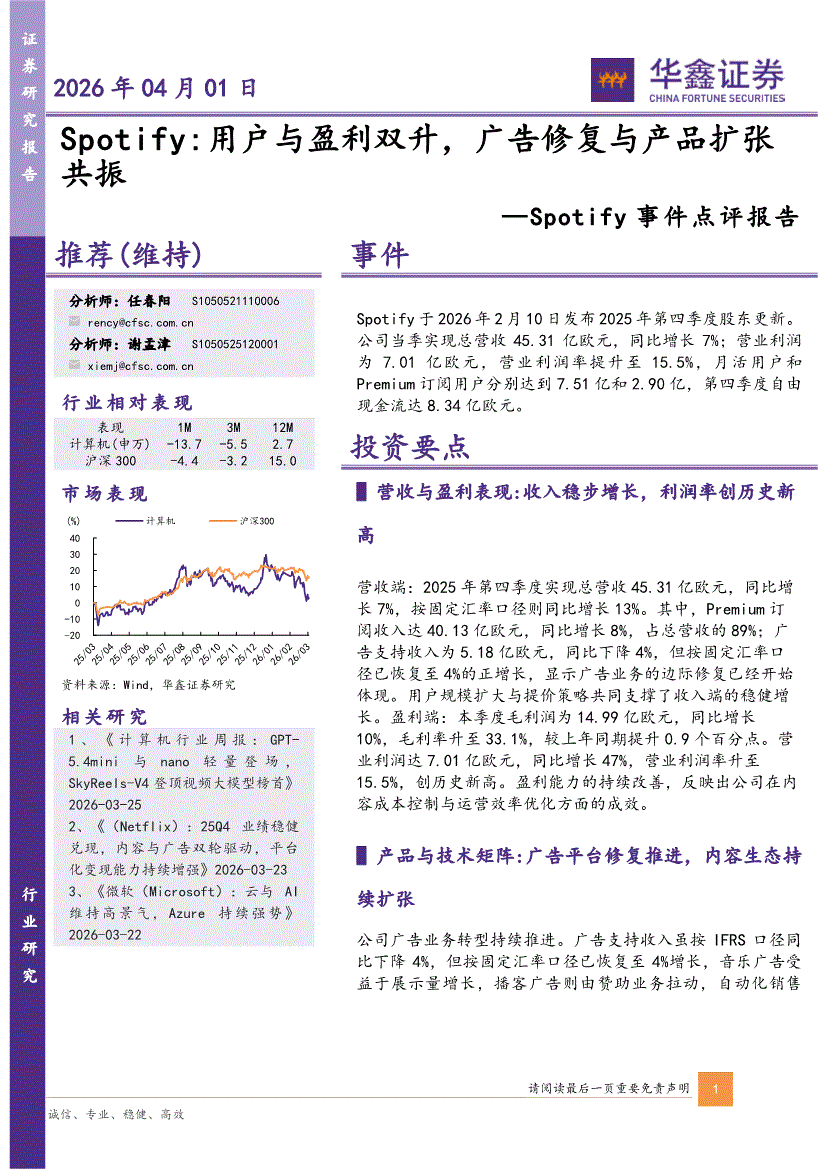 计算机行业:华鑫证券-计算机行业Spotify事件点评报告:Spotify,用户与盈利双升,广告修复与产品扩张共振-260401