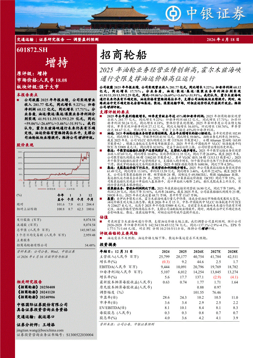 招商轮船:中银国际-招商轮船-601872-2025年油轮业务经营业绩创新高,霍尔木兹海峡通行受限支撑油运价格高位运行-260418