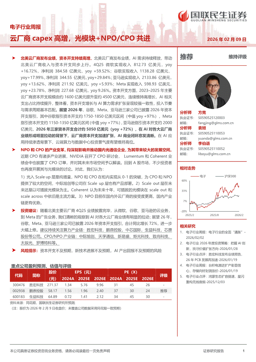 电子行业:国联民生证券-电子行业周报:云厂商capex高增,光模块+NPOCPO共进-260209