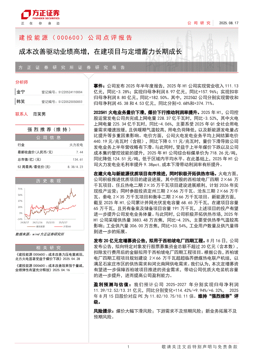 建投能源:方正证券-建投能源-000600-公司点评报告:成本改善驱动业绩高增,在建项目与定增蓄力长期成长-250817