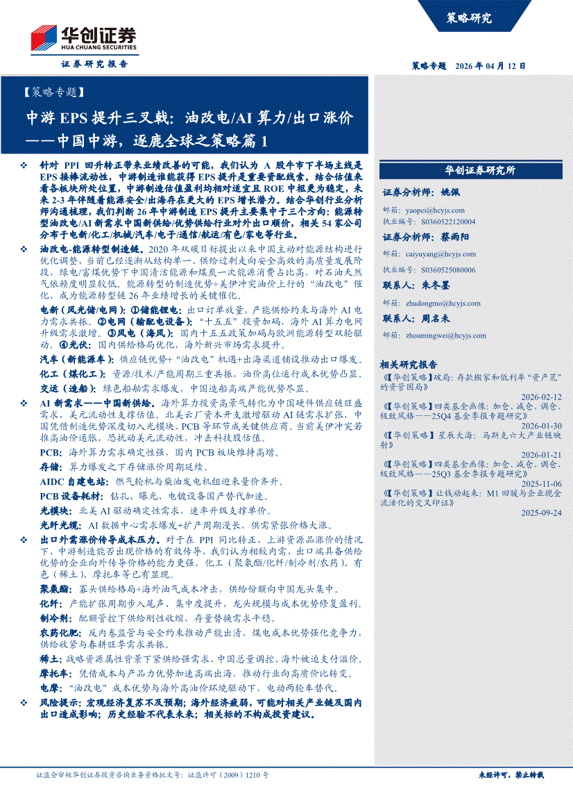 华创证券-【策略专题】中游EPS提升三叉戟:油改电/AI算力/出口涨价——中国中游,逐鹿全球之策略篇1-260412
