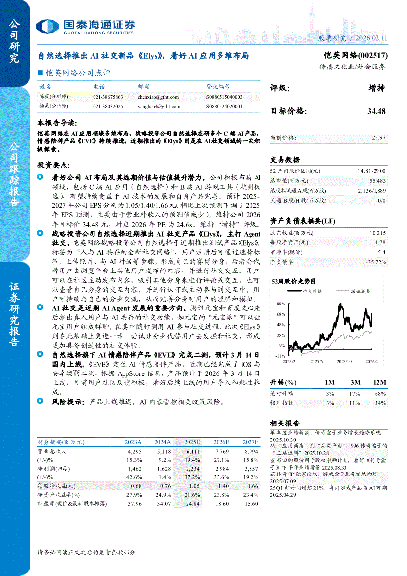 恺英网络:国泰海通证券-恺英网络-002517-公司点评:自然选择推出AI社交新品《Elys》,看好AI应用多维布局-260211