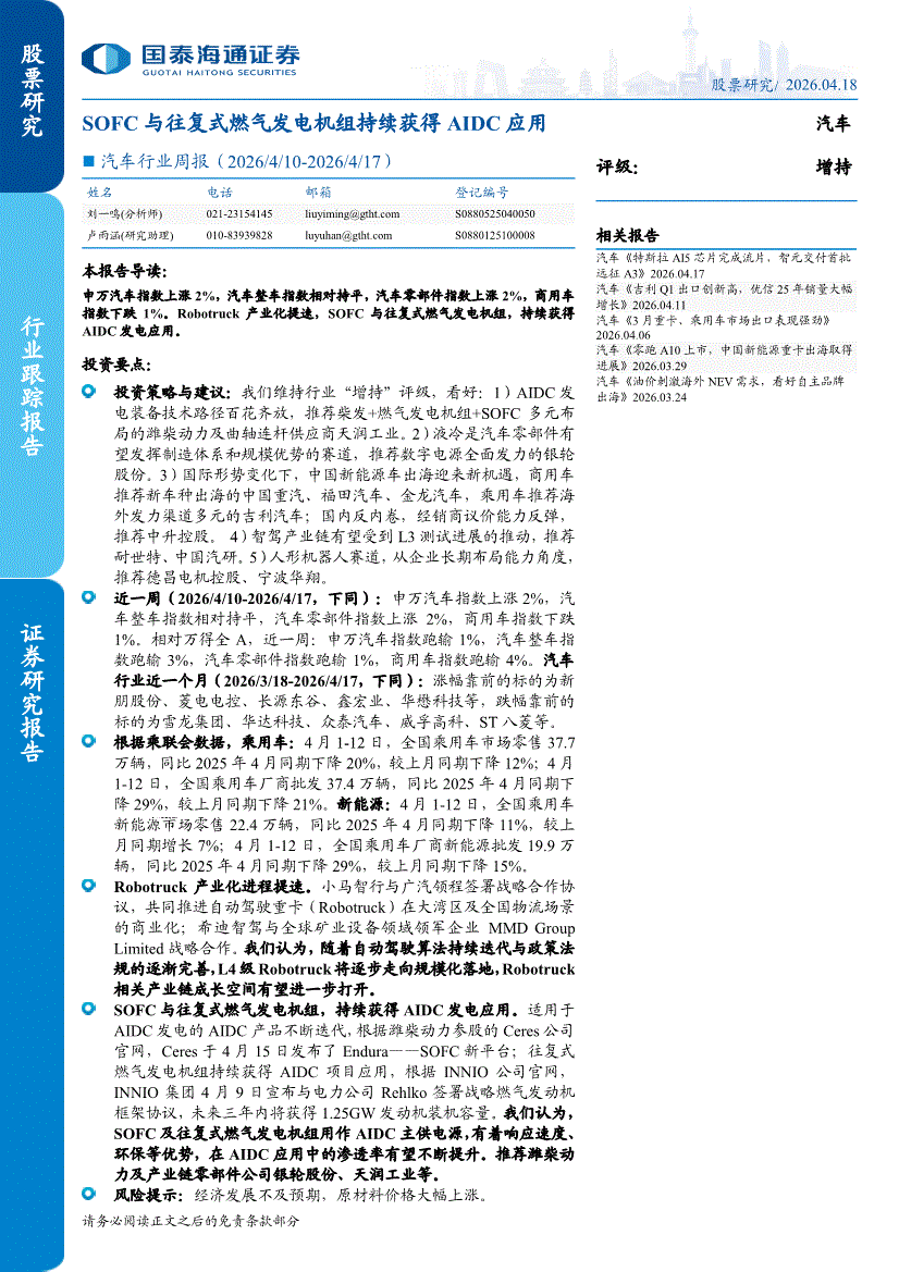 汽车行业:国泰海通证券-汽车行业周报:SOFC与往复式燃气发电机组持续获得AIDC应用-260418