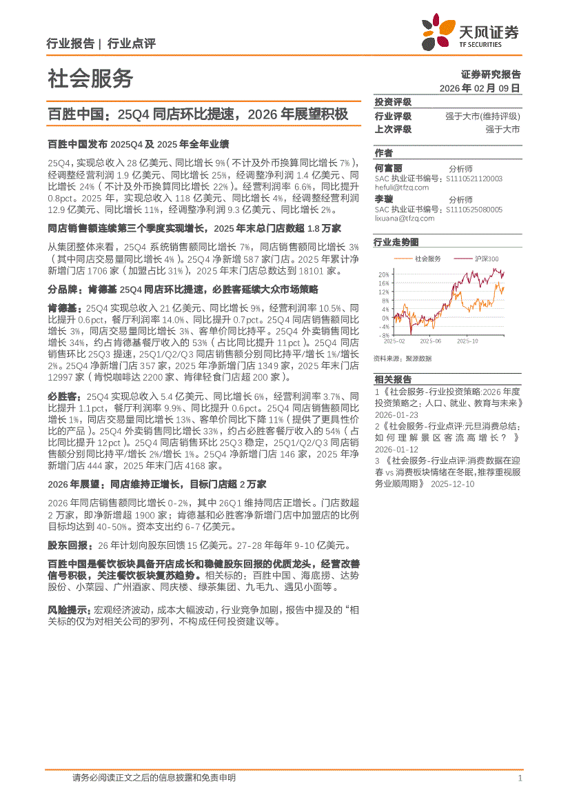 社会服务行业:天风证券-社会服务行业百胜中国:25Q4同店环比提速,2026年展望积极-260209