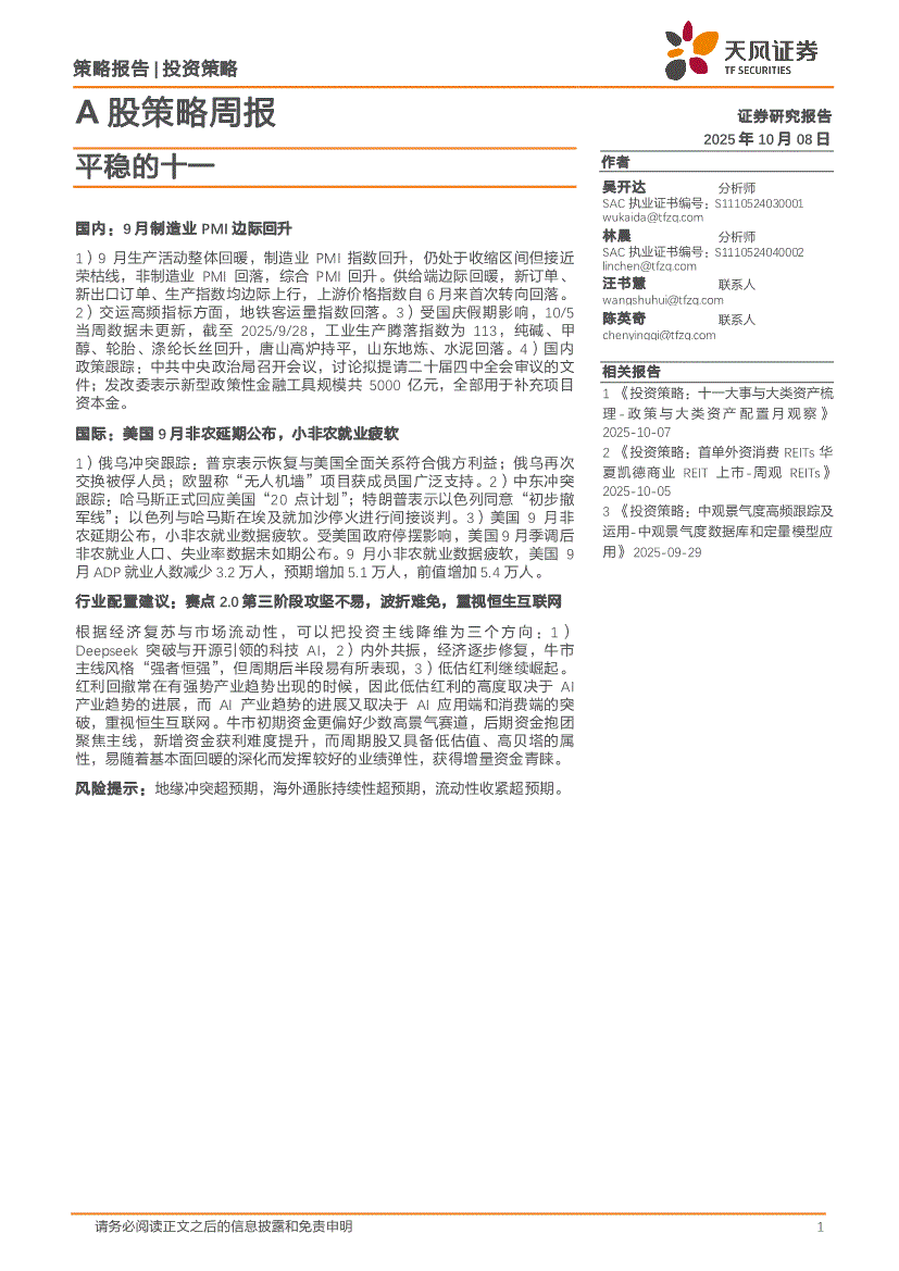 天风证券-A股策略周报:平稳的十一-251008