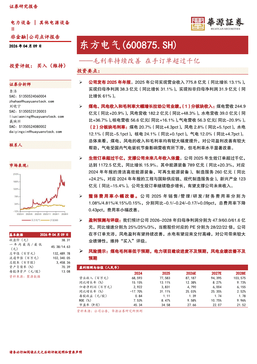 华源证券-东方电气-600875-毛利率持续改善,在手订单超过千亿-260409