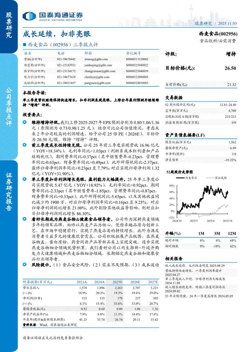 西麦食品:国泰海通证券-西麦食品-002956-三季报点评:成长延续,扣非亮眼-251103