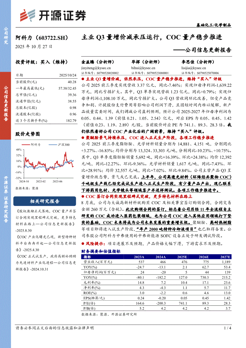 阿科力:开源证券-阿科力-603722-公司信息更新报告:主业Q3量增价减承压运行,COC量产稳步推进-251027