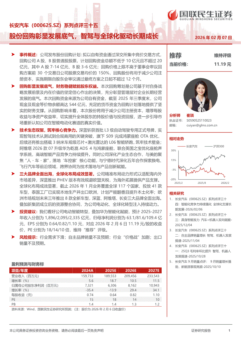 长安汽车:国联民生证券-长安汽车-000625-系列点评三十五:股份回购彰显发展底气,智驾与全球化驱动长期成长-260207