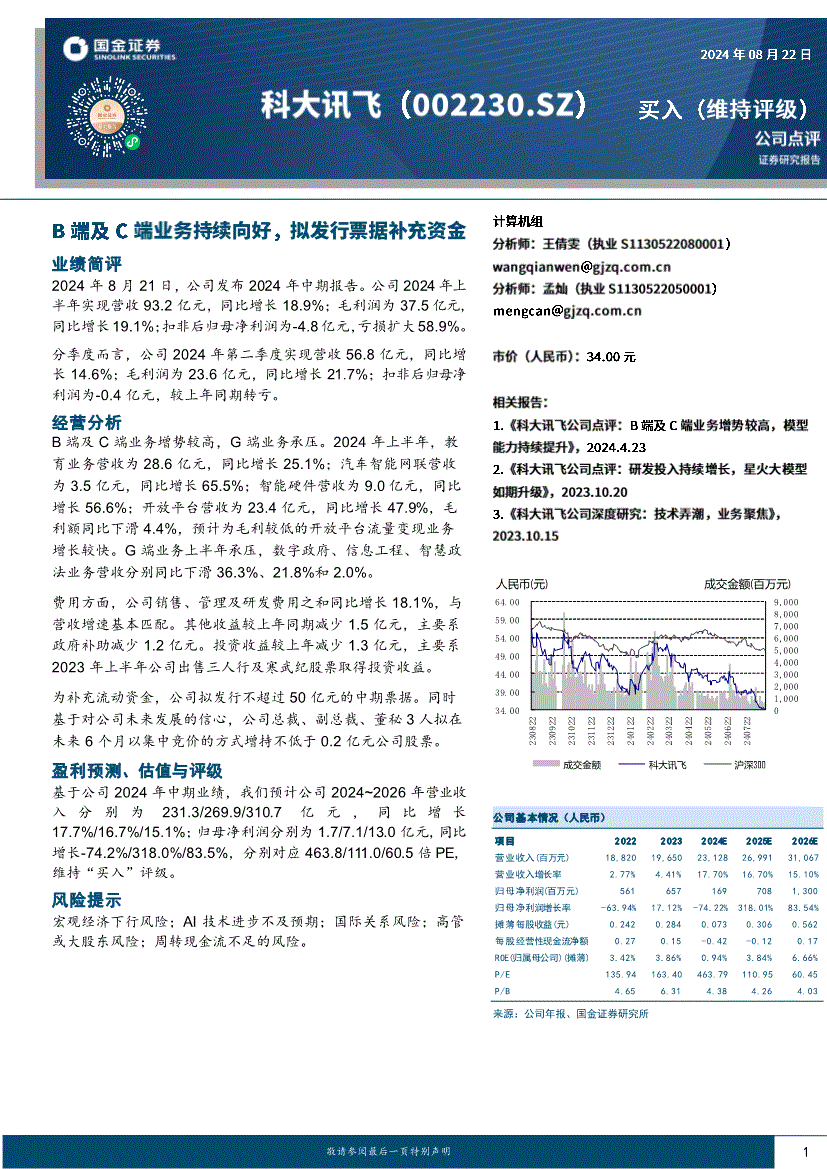 科大讯飞:国金证券-科大讯飞-002230-B端及C端业务持续向好,拟发行票据补充资金-240822