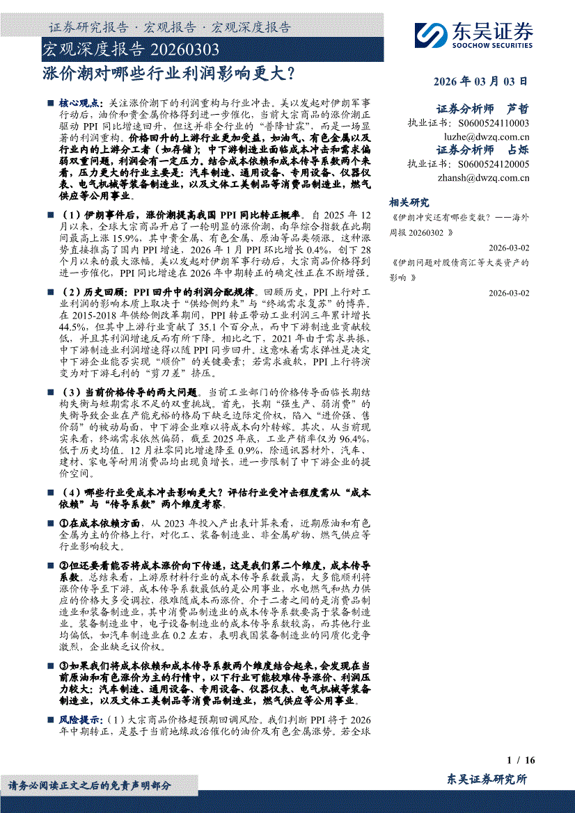 东吴证券-宏观深度报告:涨价潮对哪些行业利润影响更大?-260303