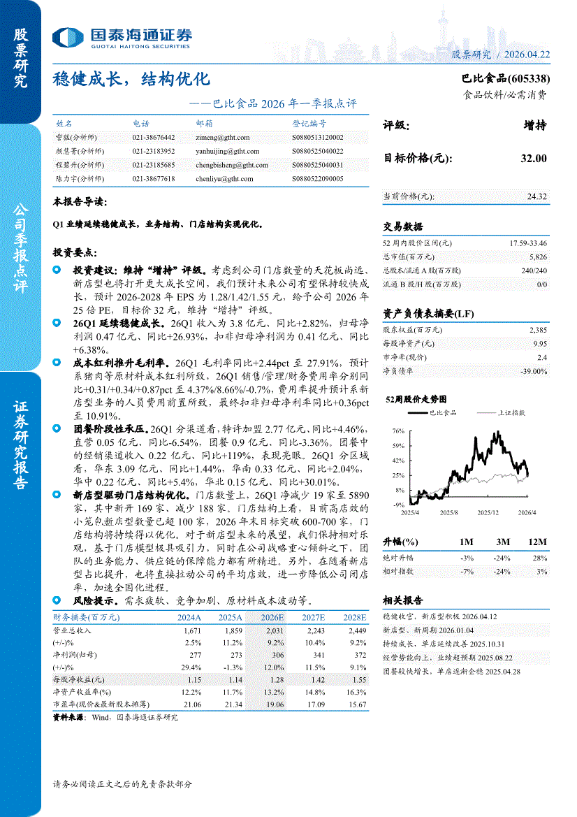 巴比食品:国泰海通证券-巴比食品-605338-2026年一季报点评:稳健成长,结构优化-260422