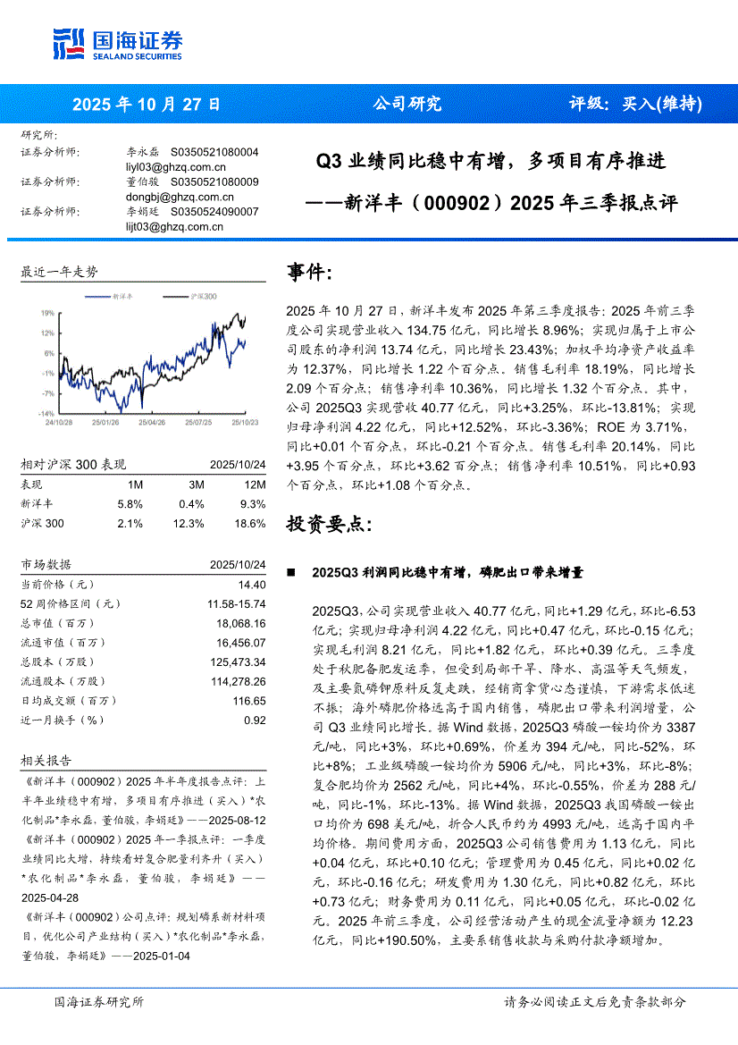 新洋丰:国海证券-新洋丰-000902-2025年三季报点评:Q3业绩同比稳中有增,多项目有序推进-251027