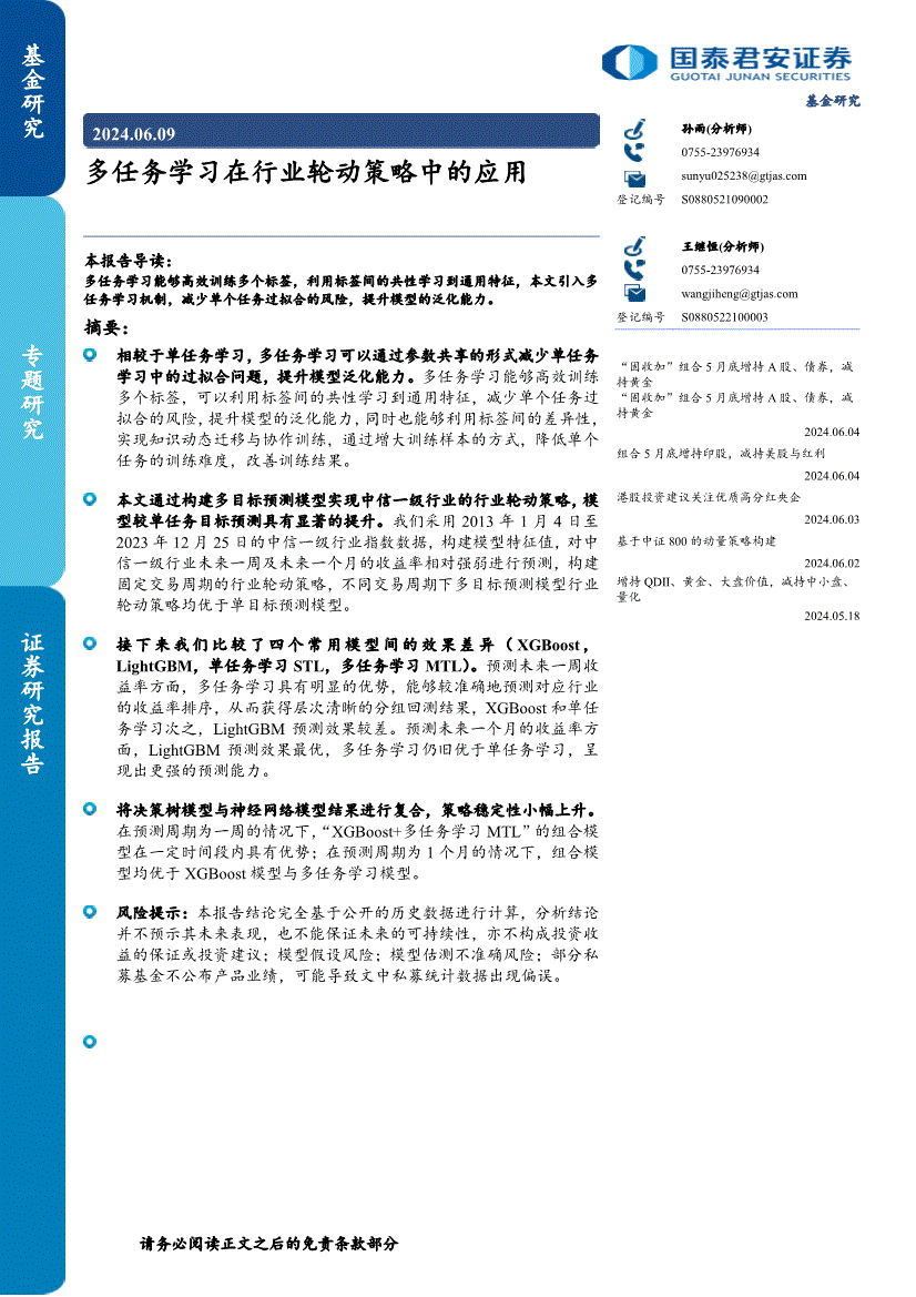国泰君安-多任务学习在行业轮动策略中的应用-240609