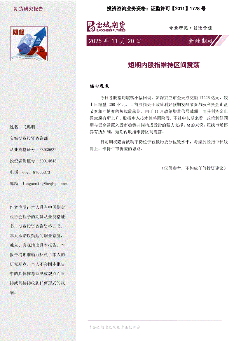宝城期货-金融期权日报:短期内股指维持区间震荡-251120