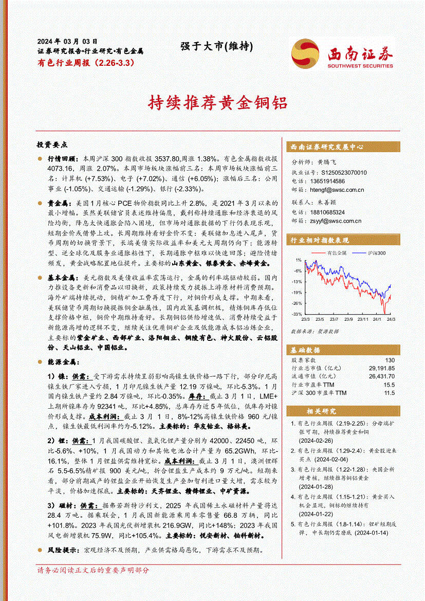 西南证券-有色行业周报(3.11~3.17):持续推荐黄金和铜-240317