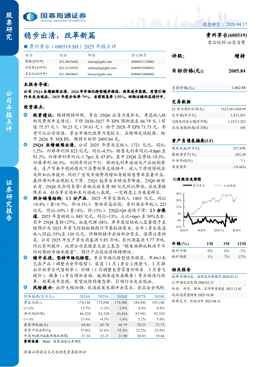 贵州茅台:国泰海通证券-贵州茅台-600519-2025年报点评:稳步出清,改革新篇-260417